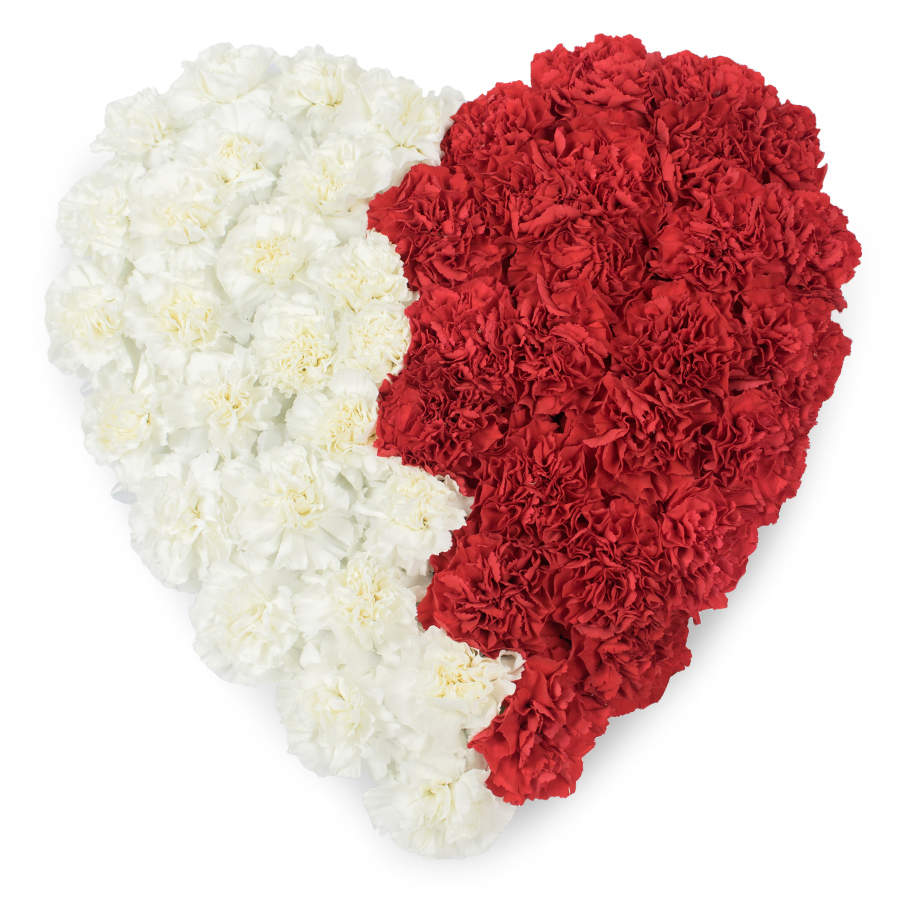 Discover an enchanting floral creation where each stem tells a unique story. Our hand-selected white and red carnations are artfully arranged into a heart shape, showcasing their rich hues and refined beauty. This artistic bouquet stands out for its creative design and luxurious feel.